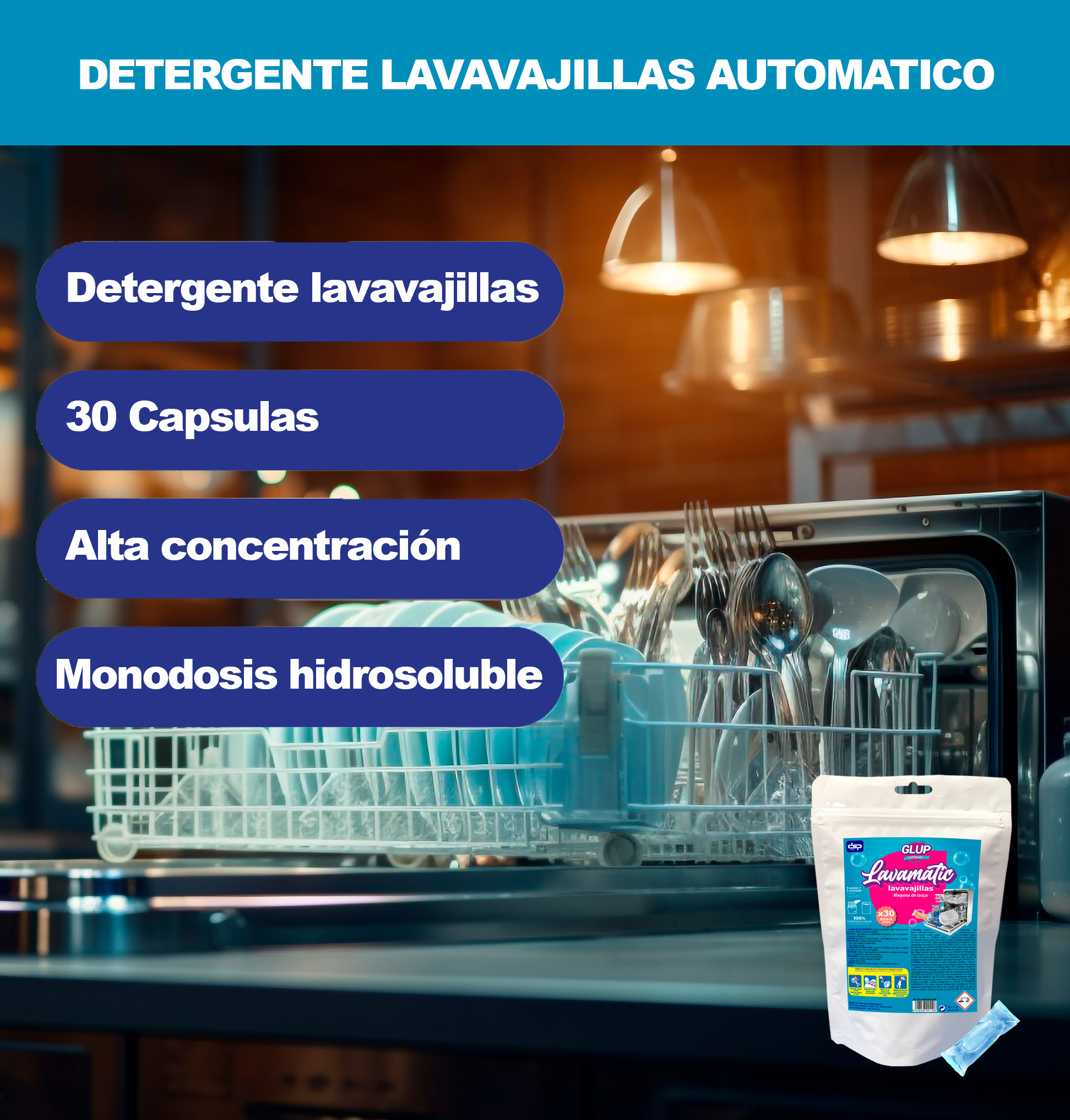 Detergente lavavajillas gel ultraconcentrado presentado en bolsita monodosis hidrosoluble para lavavajillas automáticos domésticos.