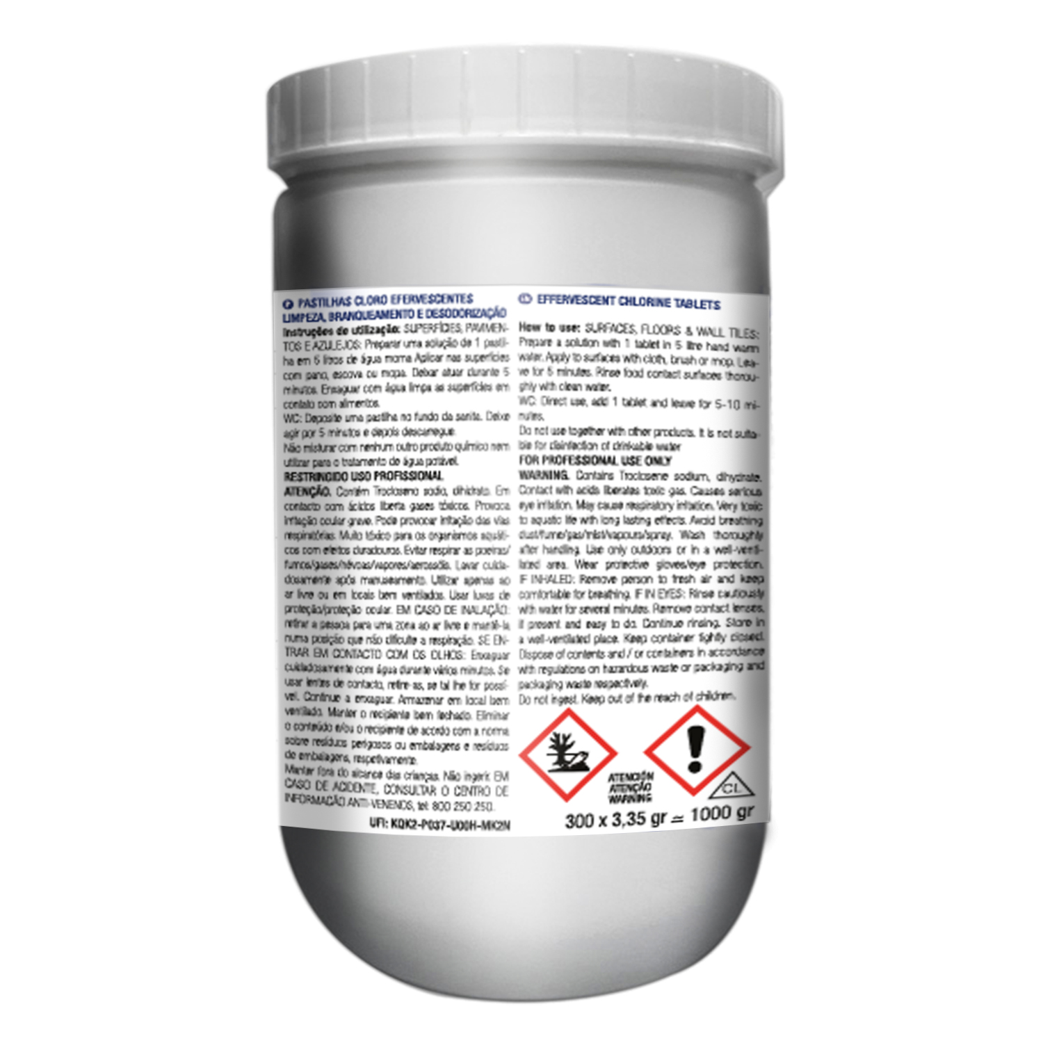 El bote de 300 pastillas (1 kg) facilita el almacenamiento y garantiza una larga duración, siendo apto tanto para uso doméstico como profesional.