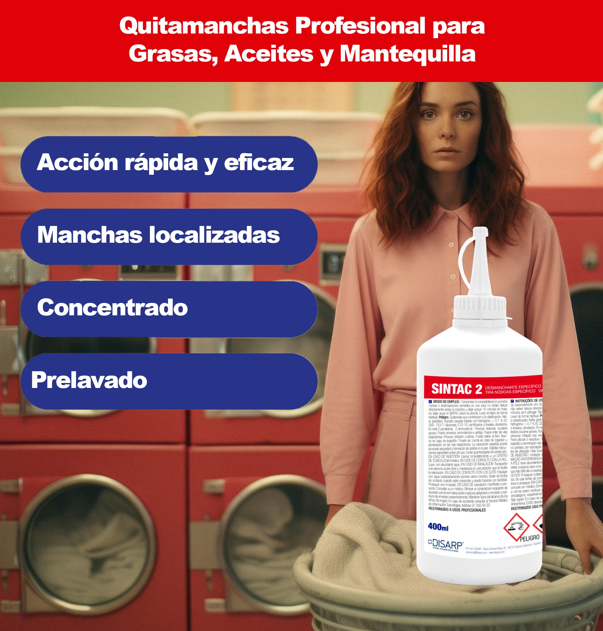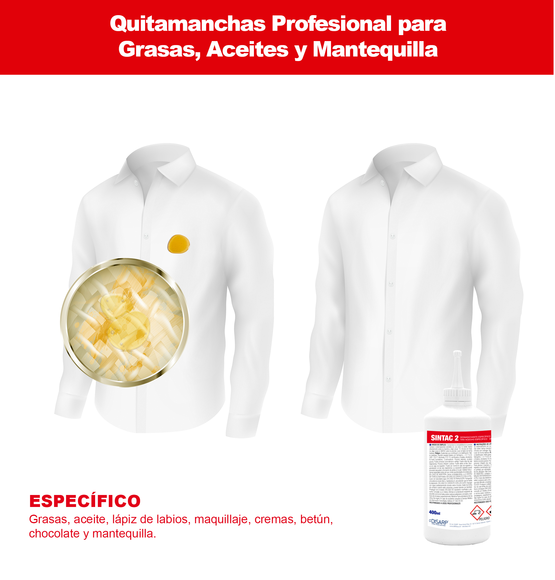 Desmanchante específico para Grasas y Aceites SINTAC ha sido desarrollado para la eliminación eficaz de manchas grasas comunes y persistentes en prendas de vestir. Gracias a su formulación específica, actúa directamente sobre: Grasa y aceite Maquillaje y lápiz de labios Cremas Betún Chocolate Mantequilla Facilita la eliminación de las manchas durante el lavado en mojado, ayudando a restaurar el aspecto original de las prendas. Este producto forma parte de la gama SINTAC de quitamanchas específicos, diseñada para ofrecer soluciones profesionales adaptadas a cada tipo de mancha, con resultados claramente superiores a los quitamanchas universales.