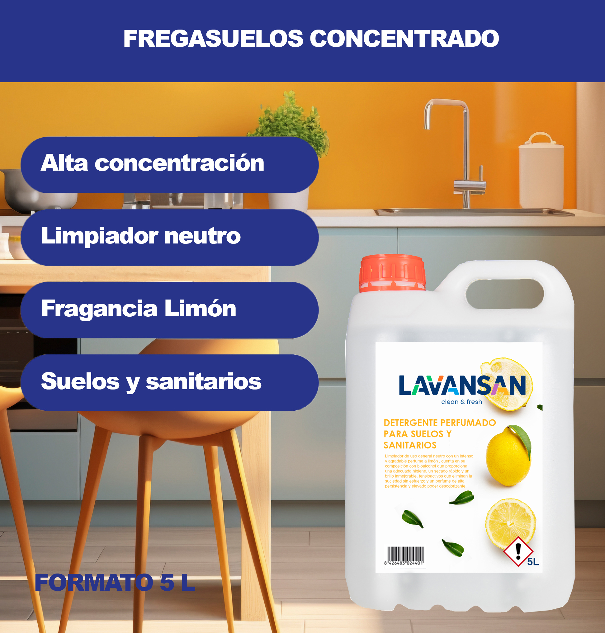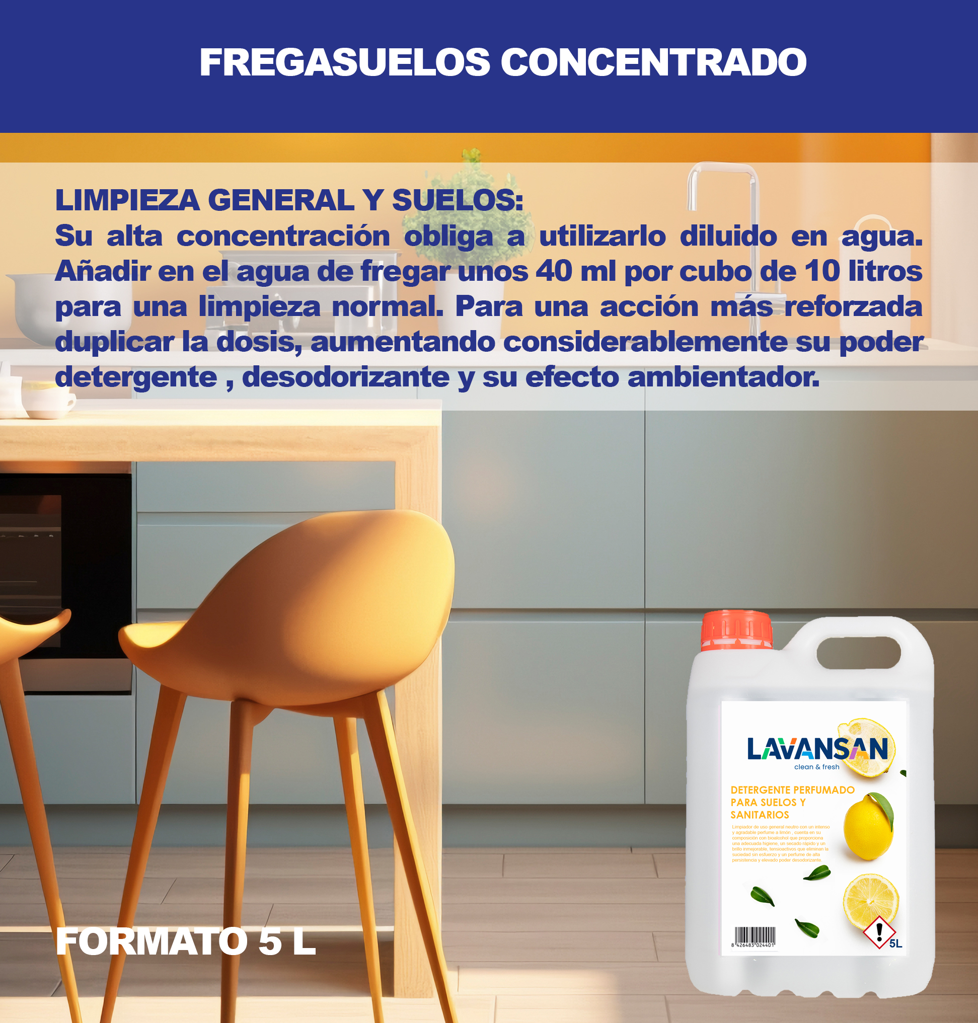 Limpiador detergente concentrado de uso general altamente perfumado cítrico, cuenta en su composición con una alta concentración de tensioactivos y perfume que le permiten eliminar la suciedad sin esfuerzo dejando una intensa sensación a limón en el ambiente.