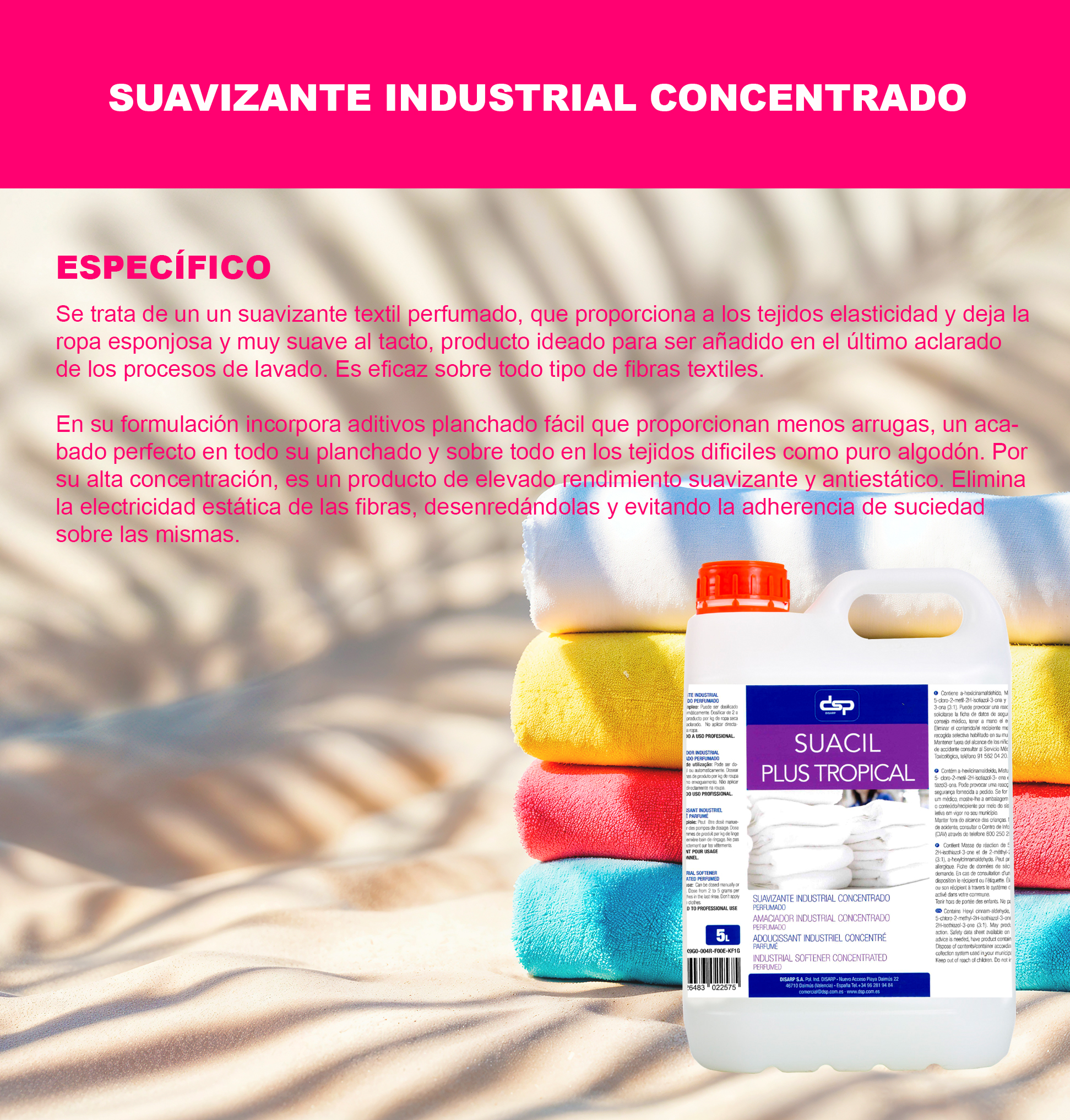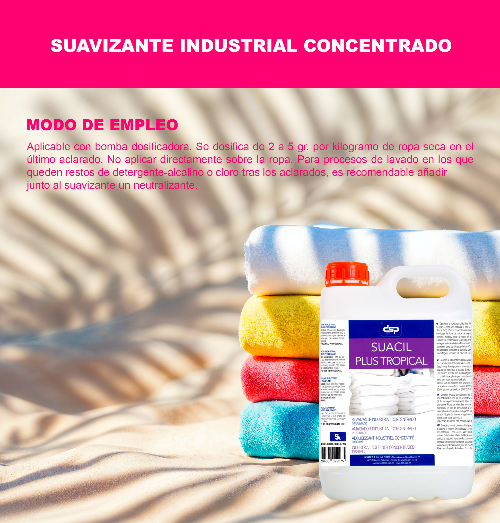 APTO PARA TODO TIPO DE FIBRAS: Eficaz sobre fibras naturales y sintéticas, manteniendo el aspecto original de los tejidos. Con versatilidad para cualquier tipo de tela y lavadora, ideal para ropa delicada y lavados intensos, asegurando un acabado suave con aroma frutal y duradero. USO DOMÉSTICO Y PROFESIONAL: Ideal para hogares exigentes, lavanderías, hostelería y procesos de lavado en mojado. Versatil y compatible perfecto para cualquier tipo de tela y lavadora, nuestro suavizante es ideal para ropa delicada y lavados intensos.